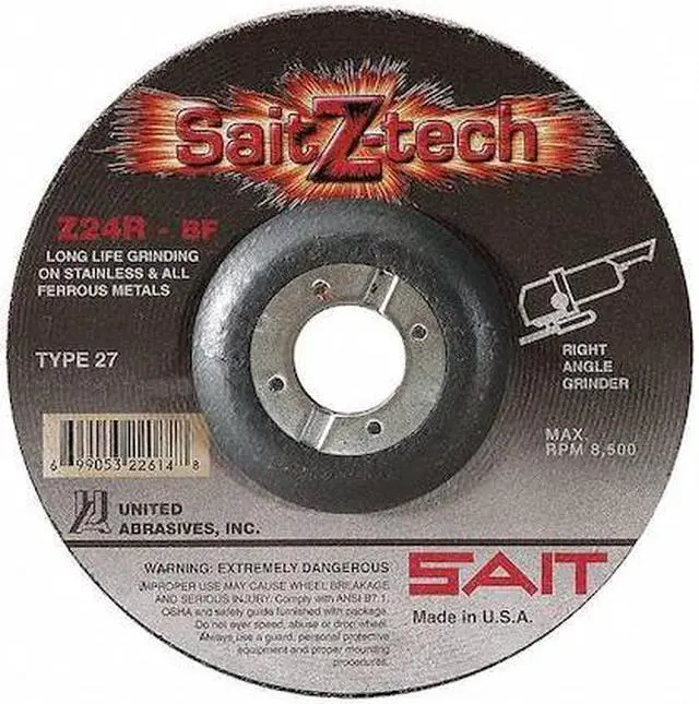Depressed Center Grinding Wheel, Abrasive Material Zirconia Alumina, Connector Size 7/8 in, Connector Type Unthreaded Hole, Grit 24, Overall Diameter 9 in, Overall Thickness 0.25 in, Primary Material Application Cast Iron, Steel, Compatible Tool Type Angle Grinder, Series Z24R, Wheel Type Type 27, Maximum Operating Speed 6, 600 RPM, Grade Extra Coarse. This item has been restricted from sale in the following state (s): []