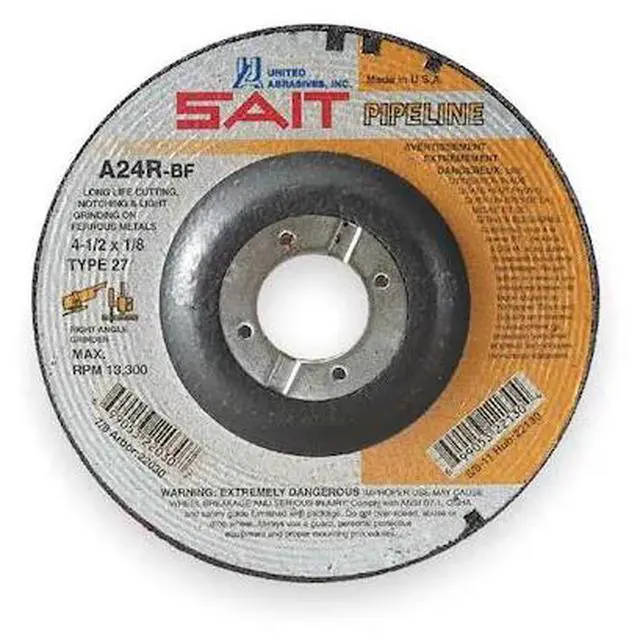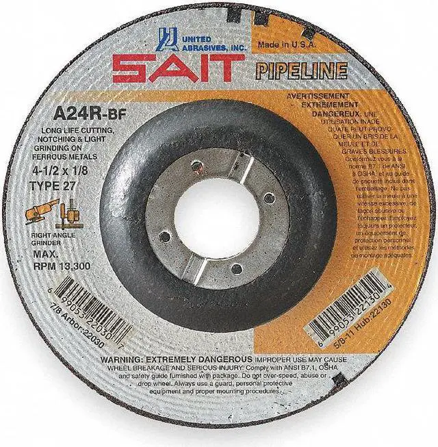 Cut-Off & Grinding Wheel, Abrasive Material Aluminum Oxide, Connector Size 7/8 in, Connector Type Unthreaded Hole, Grit 24, Overall Diameter 5 in, Overall Thickness 0.125 in, Primary Material Application Cast Iron, Steel, Compatible Tool Type Angle Grinder, Series A24R Pipeline, Wheel Type Type 27, Maximum Operating Speed 12, 200 RPM, Grade Extra Coarse. This item has been restricted from sale in the following state (s): []