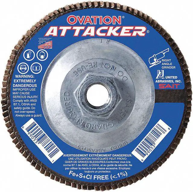 Flap Disc, Abrasive Type Coated, Abrasive Material Zirconia Alumina, Grade Medium, Series Ovation Attacker, Backing Material Cotton, Backing Weight X, Grit 60. This item has been restricted from sale in the following state (s): []