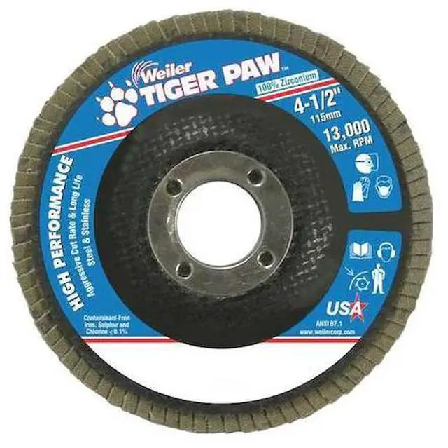 Flap Disc, Abrasive Type Coated, Abrasive Material Zirconia Alumina, Grade Medium, Backing Plate Material Phenolic, Connector Size 7/8 in, Connector Type Unthreaded Hole, Density Rating Standard, Flap Disc Type Type 27, Overall Diameter 4 1/2 in, Quick Change System Not Applicable, Series Tiger Paw, Backing Material Phenolic, Backing Weight X, Grit 60, Maximum Operating Speed 13, 000 RPM. This item has been restricted from sale in the following state (s): []