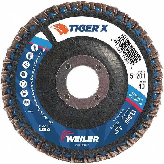 Flap Disc, Abrasive Type Coated, Abrasive Material Zirconia Alumina, Grade Coarse, Backing Plate Material Phenolic, Connector Size 7/8 in, Connector Type Unthreaded Hole, Density Rating Standard, Flap Disc Type Type 29, Overall Diameter 4 1/2 in, Quick Change System Not Applicable, Series Tiger X, Backing Material Cloth, Backing Weight X, Grit 40, Maximum Operating Speed 13, 000 RPM. This item has been restricted from sale in the following state (s): []