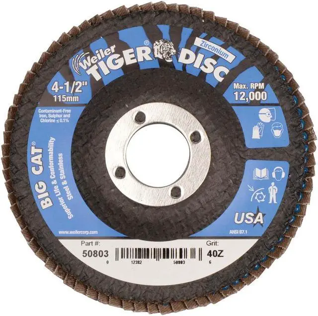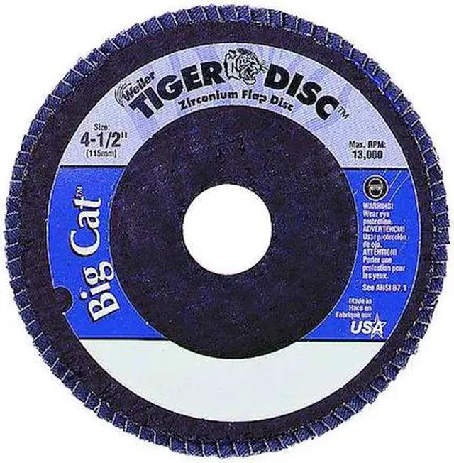 Flap Disc, Abrasive Type Coated, Abrasive Material Zirconia Alumina, Grade Coarse, Backing Plate Material Phenolic, Connector Size 7/8 in, Connector Type Unthreaded Hole, Density Rating High, Flap Disc Type Type 27, Overall Diameter 4 1/2 in, Quick Change System Not Applicable, Series Tiger Big Cat HD, Backing Material Phenolic, Backing Weight X, Grit 40, Maximum Operating Speed 12, 000 RPM. This item has been restricted from sale in the following state (s): []