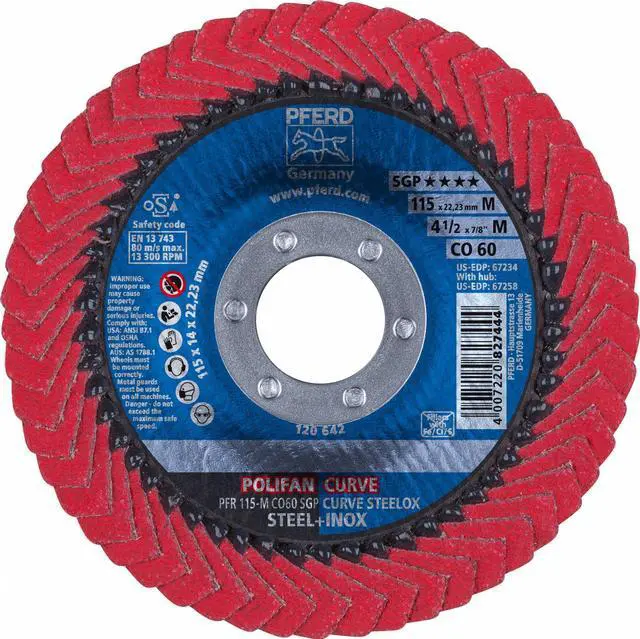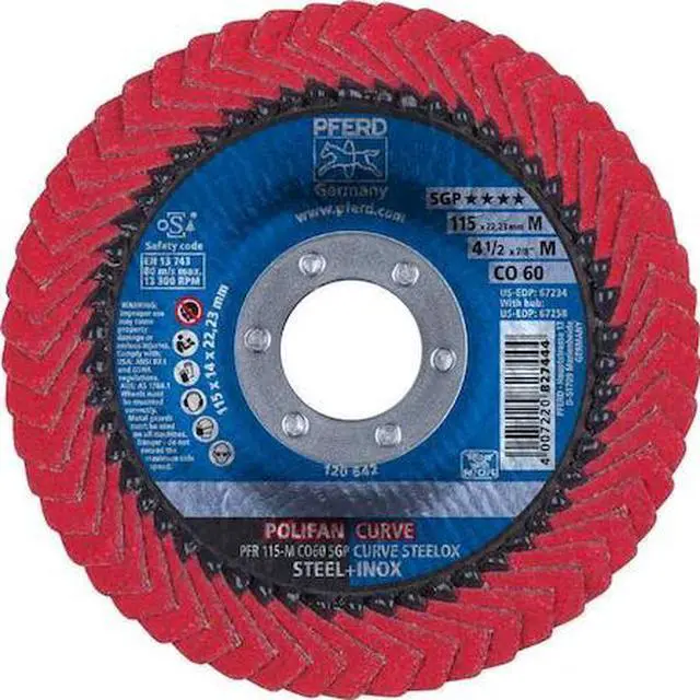 Flap Disc, Abrasive Type Coated, Abrasive Material Ceramic, Grade Medium, Backing Plate Material Fiberglass, Connector Size 7/8 in, Connector Type Unthreaded Hole, Density Rating Standard, Flap Disc Type Radial, Overall Diameter 4 1/2 in, Series CO SGP CURVE, Backing Material Fiberglass, Backing Weight Consumable, Grit 60, Maximum Operating Speed 13, 300 RPM, Features Performance Coated. This item has been restricted from sale in the following state (s): []