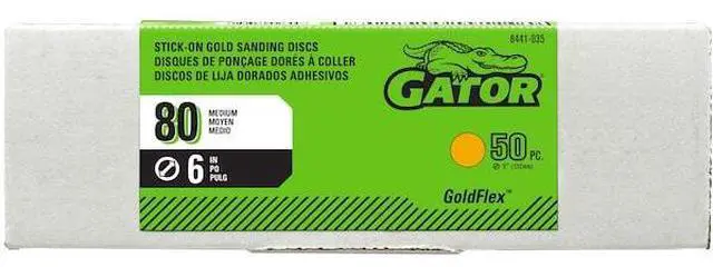 PSA Sanding Disc, Abrasive Type Coated, Abrasive Material Aluminum Oxide, Backing Material Film, Backing Weight D, Grit 80, Overall Diameter 6 in, Product Type PSA Disc, Number of Vacuum Holes Non-Vacuum, Color Gold, Grade Coarse, Package Quantity 50. This item has been restricted from sale in the following state (s): []