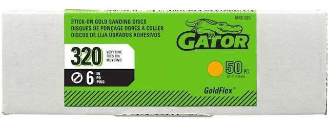 PSA Sanding Disc, Abrasive Type Coated, Abrasive Material Aluminum Oxide, Backing Material Film, Backing Weight C, Grit 320, Overall Diameter 6 in, Product Type PSA Disc, Number of Vacuum Holes Non-Vacuum, Color Gold, Grade Very Fine, Package Quantity 50. This item has been restricted from sale in the following state (s): []