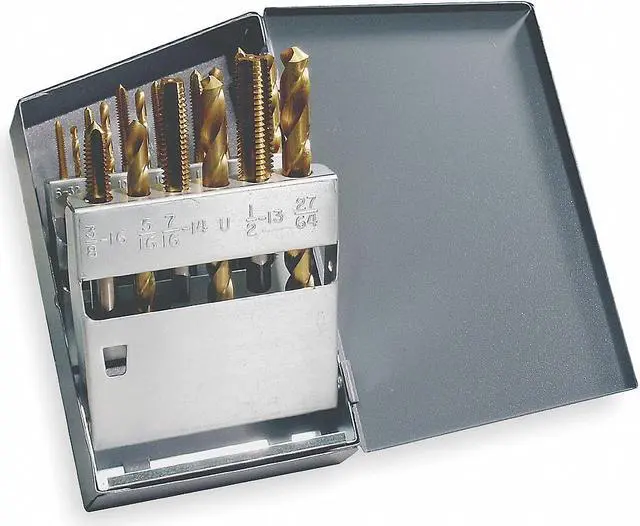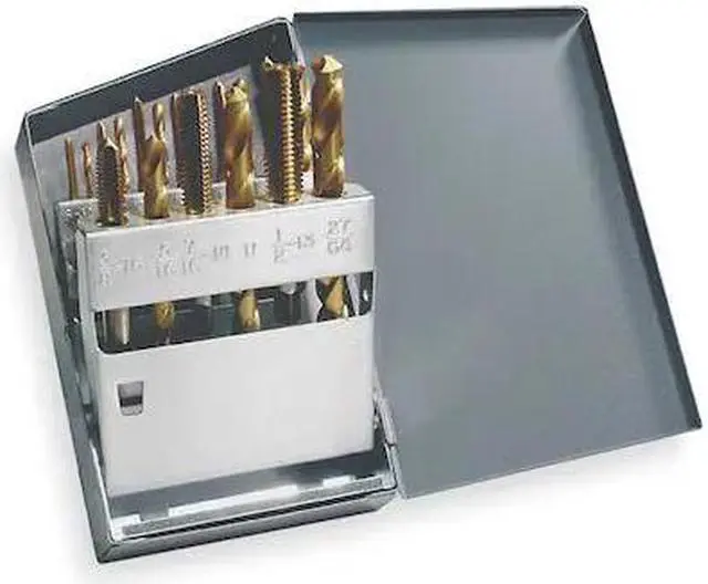 Drill Bit and Tap Set, Number of Pieces 18, Tap Type Hand Tap, Drill Bit Material High Speed Steel, Drill Bit Finish Bright (Uncoated), Drill Bit Dia. Included #21, #25, #29, #36, #7, 27/64 in, 5/16 in, F, U, Measurement System Fractional Inch, Drill Bit Point Angle 118 Degrees, Impact Rated No, Smallest Drill Bit Dia. #36. This item has been restricted from sale in the following state (s): []