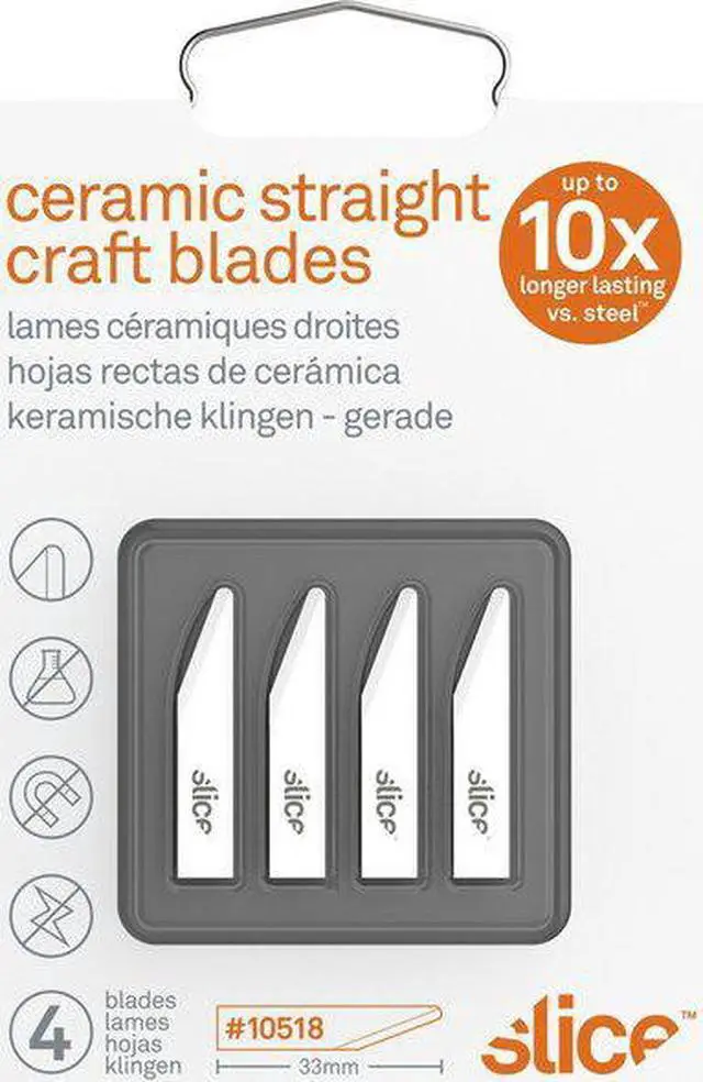 Craft Blade, Application Multipurpose, Blade Design Angled, Blade Length 1 1/4 in, Blade Material Ceramic, Blade Thickness 0.61 mm, Blade Tip Round, Blade Width 1/4 in, Compatible with Grainger Part Number 110M22, 423K09, 423K16, 423K17, 423K18, Compatible with Manufacturer Model Number 10548, 10568, 10580, 10589, Compatible with Product Type Craft Knife Blade, Precision Blade, Compatible with Series SLICE Craft Knife 10548, Blade Edge Type Straight