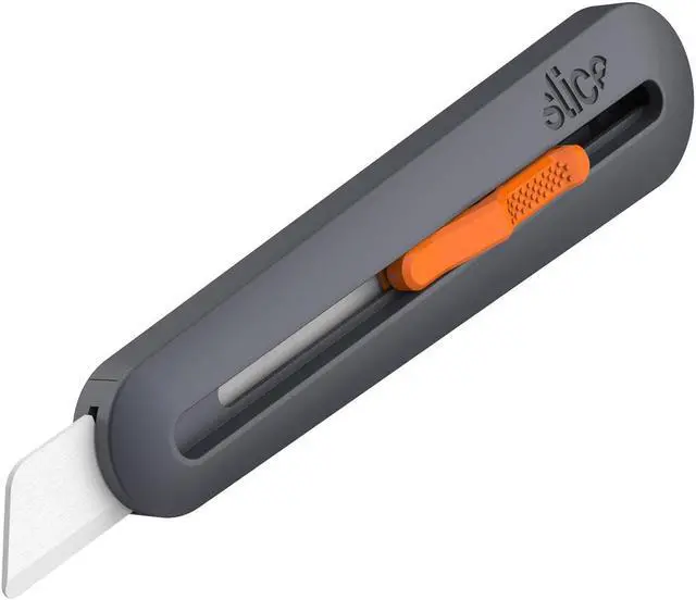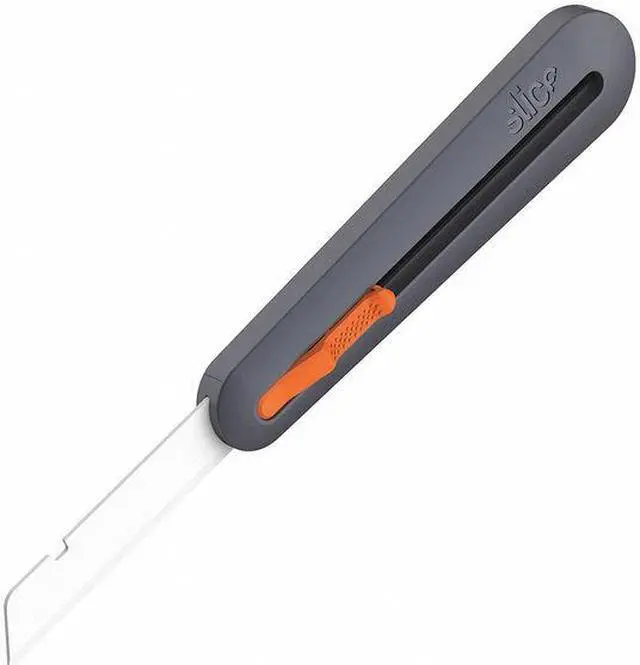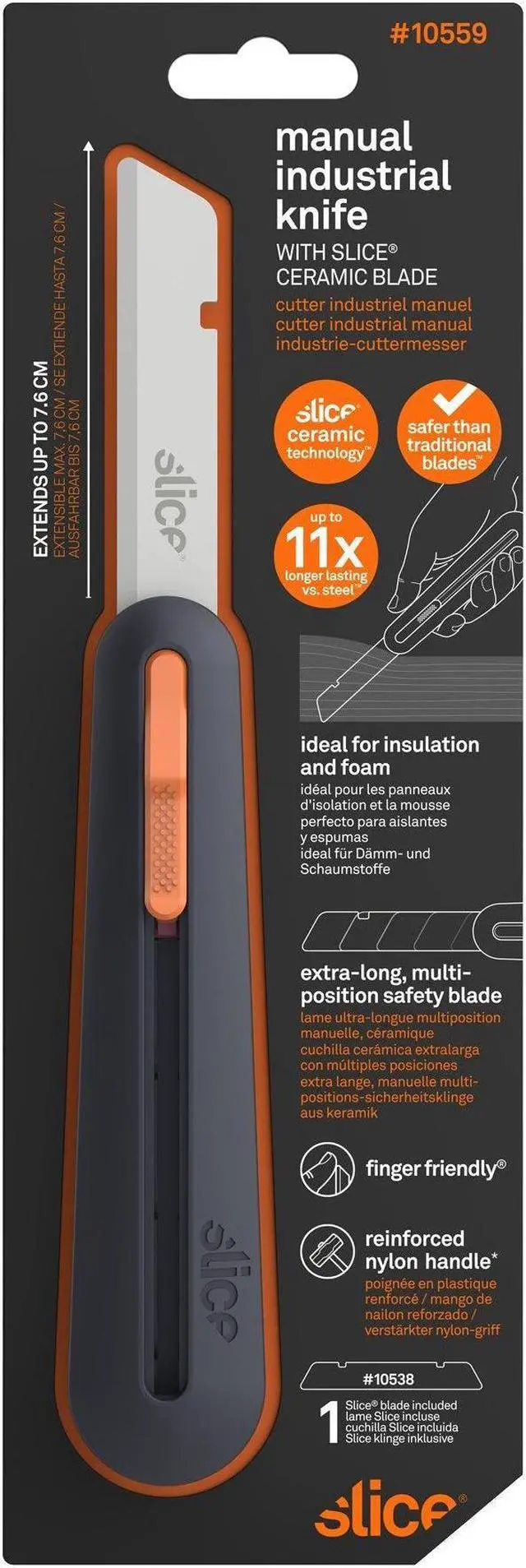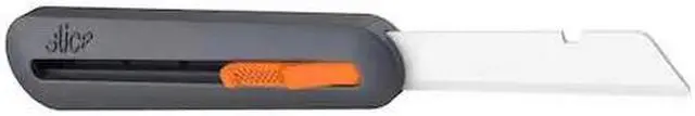 With four blade lock positions, this industrial knife cuts anything from cardboard to thick foam and fiberglass insulation. Its installed rounded-tip blade reaches a maximum cutting depth of 76 millimeters (approx. 3 inches). As with all Slice tools, the Manual Industrial Knife has an easy, no-tool blade change that also lets you switch the blade orientation for left-handed users. And the blade is finger friendly: it cuts effectively and is safe to the touch. The industrial knifes ergonomic handle is made from durable reinforced nylon, designed to last through the toughest jobs. Convenience features include a built-in lanyard hole and a quick-release blade change button. The Slice zirconium oxide safety blade is non-reactive, never rusts, and lasts up to 11 times longer than metal blades.
