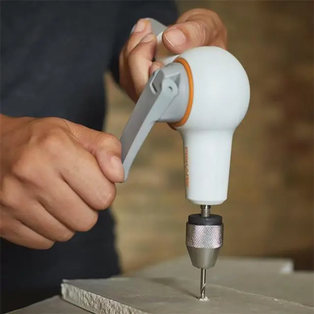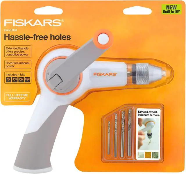 Quick and convenient, the Fiskars® Precision Hand Drill offers a cord-free, manual-powered design for precise, hassle-free holes. While powerful enough to drill through dry wall, woods, laminate and more, the real benefit of this drill is a hand-operated crank that allows for much more precise, controlled power. Perfect for all your DIY project needs, this drill comes equipped with additional features that make it easy to use, including a keyless chuck for simple bit changes and a fold-down handle for compact storage. The drill also includes four standard drill bits for use in multiple applications, including building furniture, hanging artwork and more. Additionally, an extended handle with Soft grip adds stability and control.