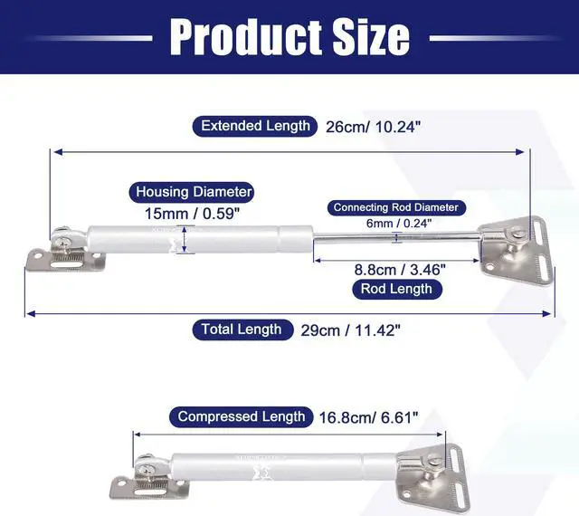Note: Do not compress them by hands before installation, the struts could only be compressed after installing successfully. After installation, the lid/cover would be opened or closed smoothly. Working temperature: -25 Degree Celsius70 Degree Celsius.