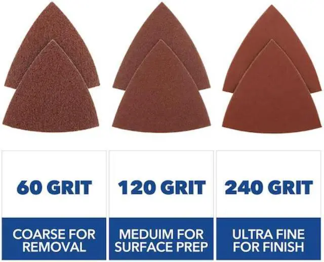 As part of the Dremel Universal True Fit series, the MM700-6 Multi-Tool sanding pads deliver trusted performance in sanding various surfaces. 60-Grit coarse sanding for material removal. 120-Grit for medium sanding for surface preparation. 240-Grit ultra for fine sanding for smooth finishes. With Dremel® Universal True Fit oscillating blades and sanding pads you dont need to compromise performance for price. Tackling a different material? Dremel's full-range has you covered! Universal True Fit blades can scrape paint and adhesive, cut drywall, pipe and wood, sand stubborn paint and materials - and thats just the short list.