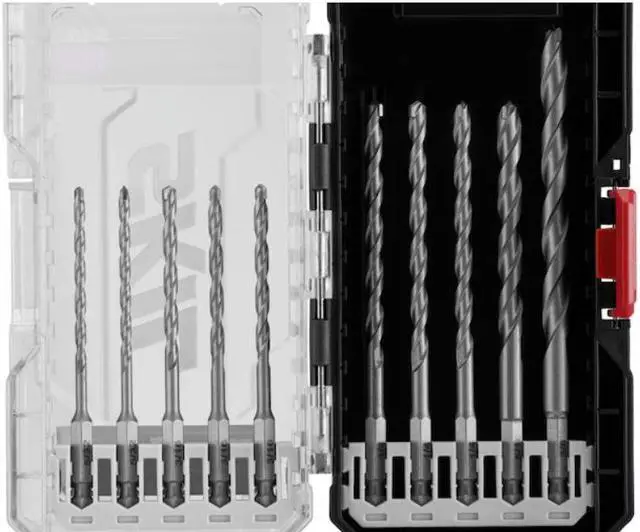 The SKIL 10-Piece Hex Shank Carbide Hammer Drill Bit Set includes 10 carbide-tipped 1/4-inch hex shank hammer drill bits for use on masonry like brick, block, and light concrete. The bits are packed in a SKIL modular bit case system for easy customized layouts, interlocking functions for stacking out your combination, and auto-connect snap latches for convenient one-handed use.