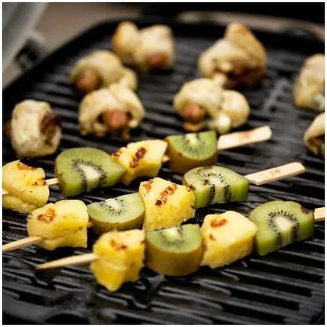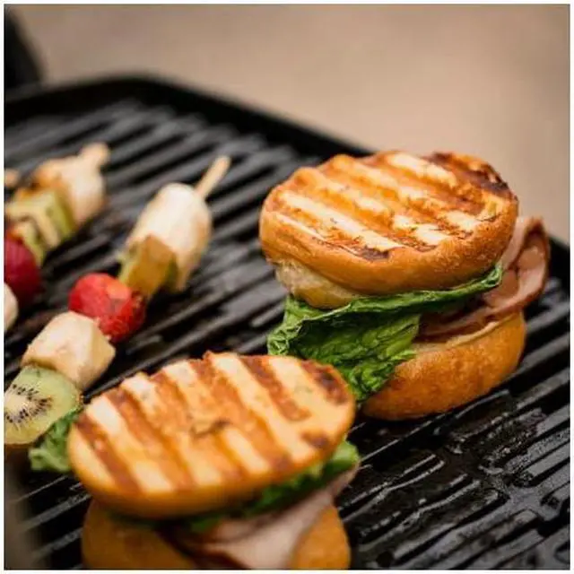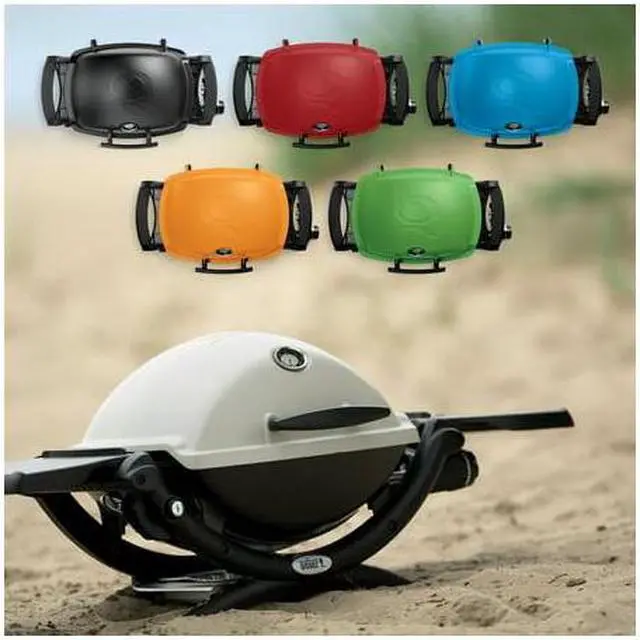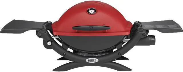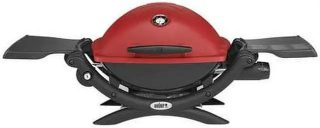 Cast aluminum lid and body with a glass-reinforced nylon frame. Features: electronic ignition, infinite control burner valve, built-in thermometer, 2 folding work tables, and removable catch pan. Uses disposable 14.1 or 16.4 oz LP cylinder (sold separately).