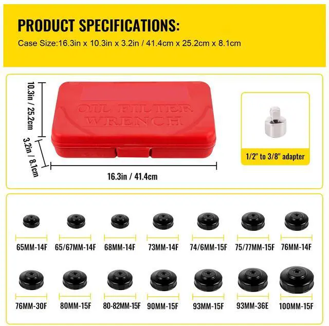 14PCS Oil Filter Socket Set: Our oil filter wrench set includes 14 low profile sockets in sizes: 65/67MM-14F, 68MM-14F, 76MM-30F, 73MM-14F, 65MM-14F, 74/6MM-15F, 75/77MM-15F, 90MM-15F, 93MM-36E, 76MM-14F, 100MM-15F, 93MM-15F, 80MM-15F, 80-82MM-15F, 1/2" to 3/8" adapter, so you can work on a variety of cars.