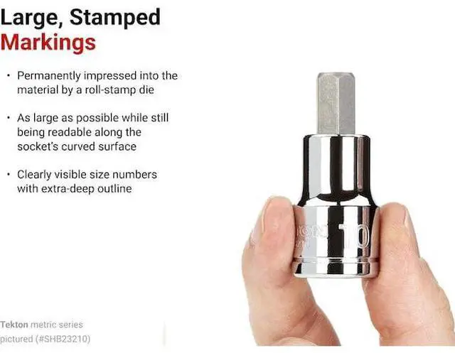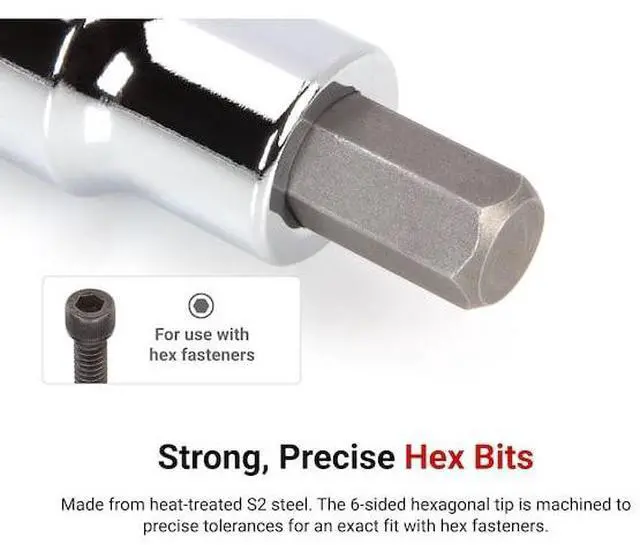 TEKTON S2 steel bits are press-fit into the socket for a straight, permanent connection that can't loosen over time. The 6-sided hexagonal tip is machined to precise tolerances for an exact fit with hex fasteners. Its chamfered end easily slides into fasteners, reducing wear.