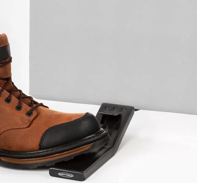 This premium drywall foot lift from GypTool is a foot operated lever for raising drywall panels off the ground for easier installation. This tool is crafted from high-grade steel and is light enough to use all day but tough enough to last for years. It lifts all standard drywall sheets, plywood sheets, and much more. This drywall foot lift will fit in a pocket or tool pouch for easy transport. It is designed with a rocking frame and is balanced so that the front edge starts on the ground so insertion under items is easy.