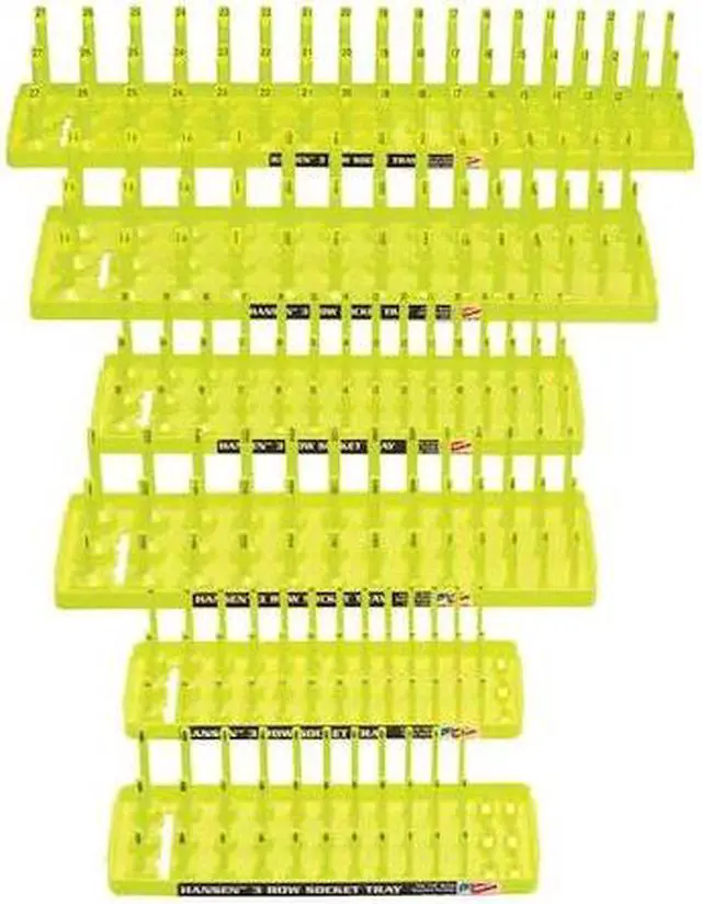 Yellow, Socket Tray, Plastic, 22 5/8 in Overall Width, 4 1/4 in Overall Depth, 4 1/4 in Overall Height, For Socket Size/Type 1/2 in, 1/4 in, 3/8 in, Number of Posts/Slots 39, 42, 45, 54, Number of Rows 3, Number of Trays 6
