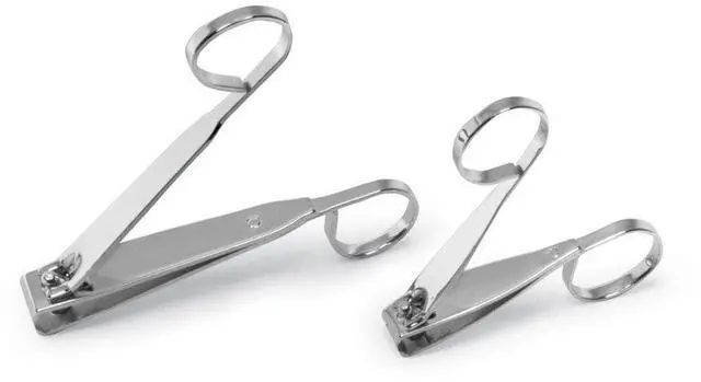 Clever scissor-like handle is specially designed to make these unique clippers easy to use, providing you with more control. Perfect for trimming fingernails and tough toenails. Great for people with arthritis and limited dexterity. Set includes a large and a small pair of clippers. Chrome-plated steel. Small: 3"L; large: 4 3/8"L.