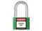 Lockout Padlock, Body Color Green, Body Height 2 in, Body Material Aluminum, Body Thickness 11/16 in, Body Width 1 5/16 in, Header None/No Header, Key Type Keyed Different, Shackle Diameter 1/4 in, Shackle Height 1 7/16 in, Shackle Material Hardened Steel, Shackle Type Open, Width Across Shackle 7/8 in, Legend Danger Locked Out. This item has been restricted from sale in the following state (s): []