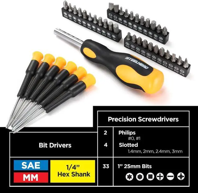 - [Phillips: #0, #1, #2(4), #3] [Slotted: 5/32" (3), 3/16", 1/4", 9/32"] [Star: T10, T15, T20, T25, T27, T30, T40] [PZ: #1, #2, #3] [Square: S1, S2 (2), S3] [Hex: 3/32", 1/8", 5/32", 3/16", 7/32", 1/4"]