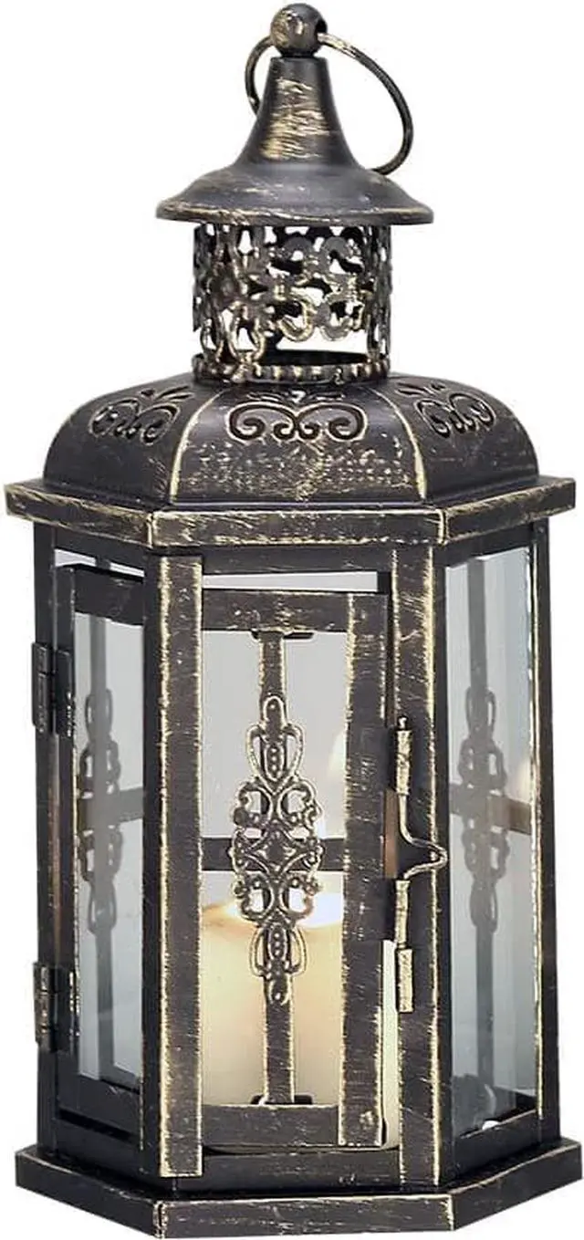 Decorative Lanterns -10 inch High Vintage Style Hanging Lantern Metal Candleholder Black with Gold Brush