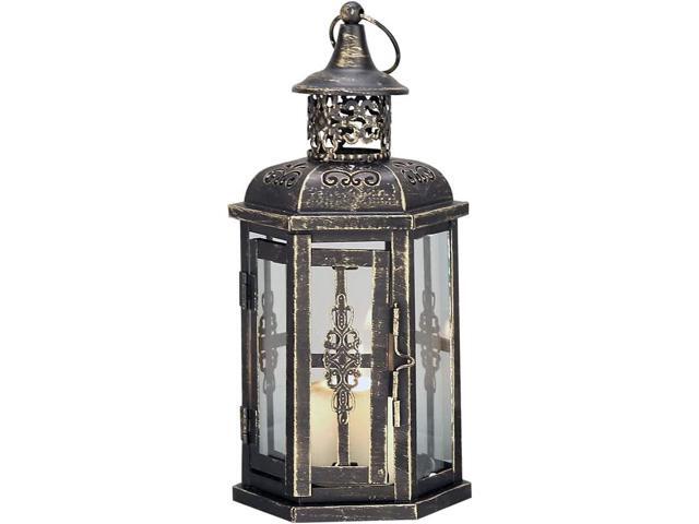 Decorative Lanterns -10 inch High Vintage Style Hanging Lantern Metal Candleholder Black with Gold Brush