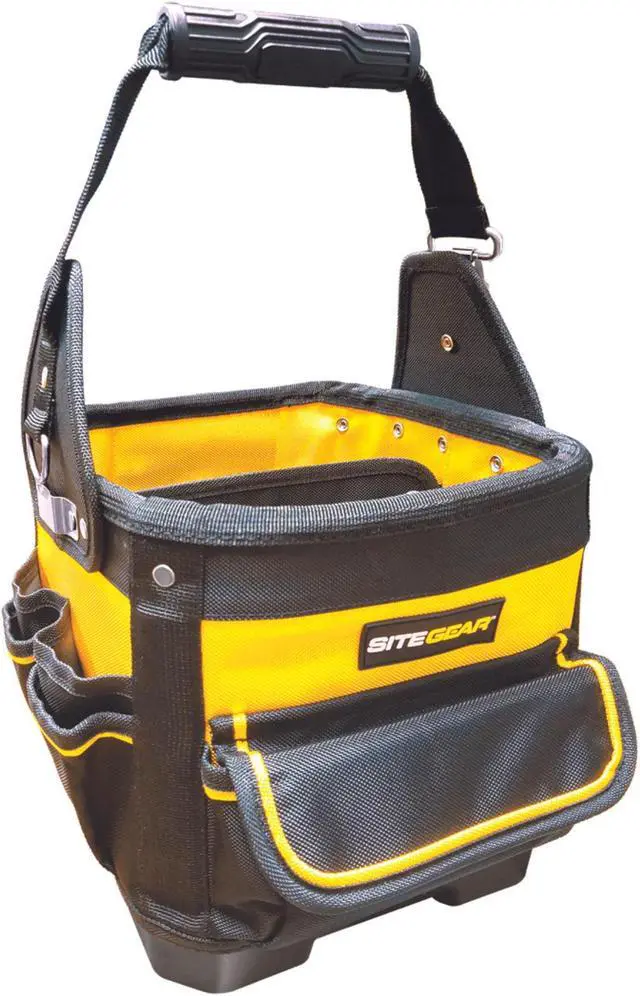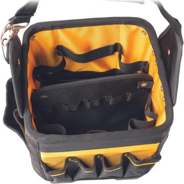 The DW SitePro SITEGEAR Electrical & Maintenance Ballistic Tool Carrier is an 11-in. tool bag that has 32 pockets, sleeves, and slots to help organize and carry a wide variety of tools. It's made of durable water-resistant 600D polyester with reinforced rivets. The molded polypropylene base keeps the carrier sturdy and increases wear resistance. The compact box-shape design prevents tipping over and is easy to store when not in use. It also features a non-slip, ergonomic carrying handle with a key clip for quick removal allowing easy access to your tools. Country of Origin: United States.
