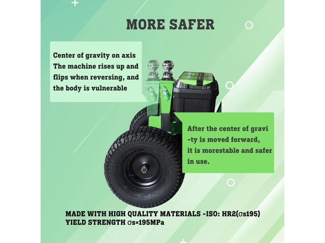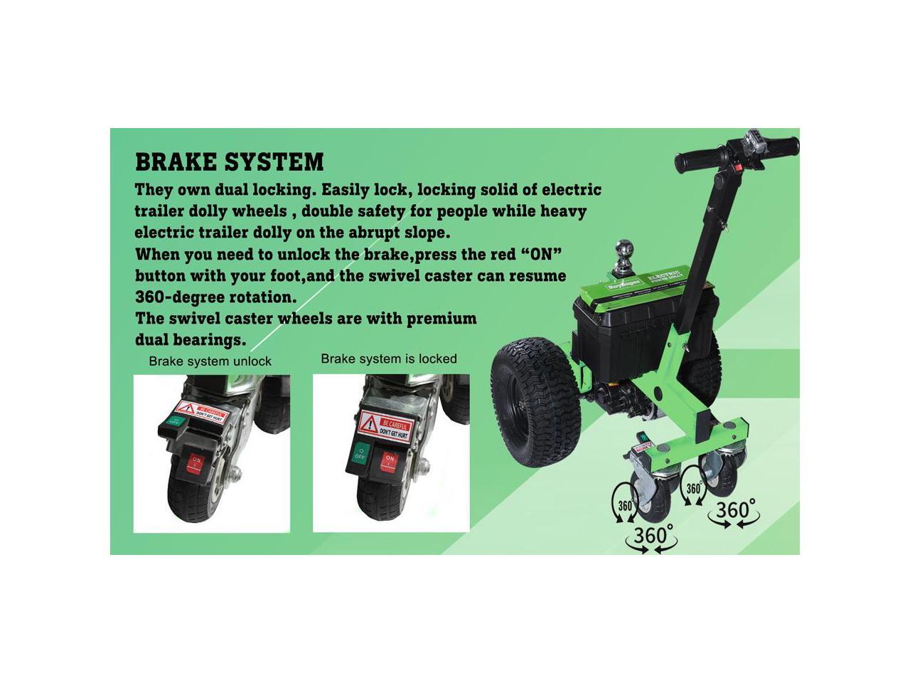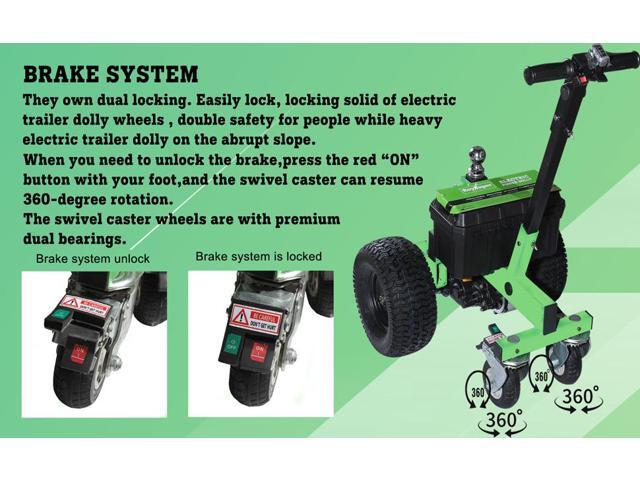 - Equipped with two 13-inch tires and two 6-inch swivel casters with brakes, our motorized trailer dolly offers unmatched stability and control. Its ball mount accommodates both 2" and 1-7/8" couplers, making it a versatile choice for any trailer.