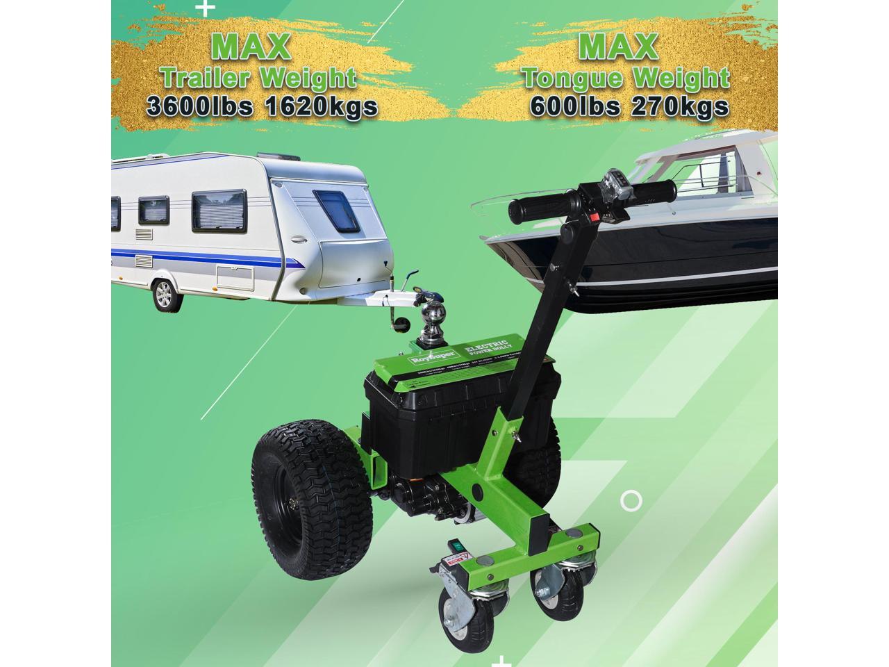 - Looking for a reliable and powerful motorized trailer dolly? Look no further than our 850W 24V DC electric driven Trailer Dolly! With a maximum capacity of 3600 lbs, it's the perfect choice for RV trailers, Travel Trailers, Caravans, Utility Trailers, Glider, Aircraft ,Cargo Trailers, Boat Trailers, Food Stands, Large Trailer Generators, Medical Trailers and fish houses with ease.