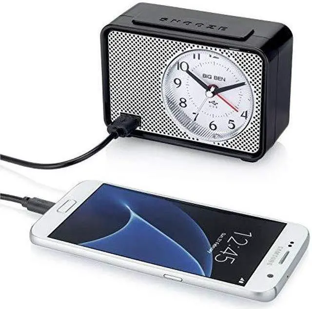 BIG BEN Alarm Clock with Charging Port, Lighted Dial, Analog Display, Alkaline Battery, AAA Battery, Plastic Lens, Plastic Case, Black/Silver Case, Dimensions: 3 in H x 4.4 in W x 1.75 in D
