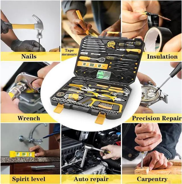Includes: Comprehensive assortment of professional-grade wrenches, ratchets, a complete range of 1/4 inch and 3/8inch metric-sized sockets and precision screwdriver, hammer, tape measure, pliers, wrench,and etc. The 72-tooth ratchet easily shift to change direction by flick of 5-degree switch.Variety of 1/4-inch screwdriver bits: Phillips, slotted, square, star and pozi.Also includes soft-grip handle on screwdriver, plier, srtipper and hammer provides excellent comfort and control.