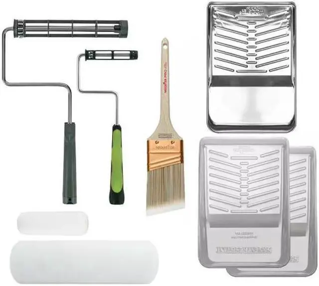 Wooster Pro Woven Roller Tray Kit includes a total of 8 pieces. The contents include a 9 in. Sherlock roller frame, Sherlock Mini roller frame, Wooster Pro Woven 9 in. x 1/2 in. nap roller cover, Wooster Pro Woven Mini 4½ in x 1/2 in. nap roller cover, 2 in. Wooster Pro Firm Nylon/Polyester thin angle sash brush, Deluxe Metal Tray and (2) Deluxe Tray Liners. Cutting-in is a breeze with the 2 in thin angle sash brush. Matching fabrics in both the standard and mini size covers ensures you consistently match finish. The Wooster Sherlock Roller Frames with quick-release spring prevent roller slippage and allow for hands-free removal of the roller covers. Sherlock frames paired with the woven 1/2 in. covers are sure to provide smooth/lint-free results. Form-fitting paint tray liners resist cracking and extend the life of the tray. Convenience, savings and value are offered by this kit to professionally complete your project.