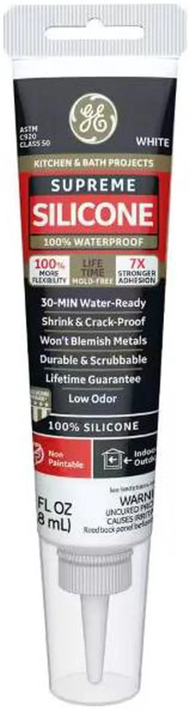 GE Supreme Silicone Kitchen and Bath sealant is a premium, 100% silicone and 100% waterproof sealant ideal for areas that are constantly exposed to moisture-especially those in the kitchen and bathroom. Our sealant also has a 30-minute water-ready formula and resists stain-causing mold and mildew growth. This silicone sealant offers 100% more flexibility than Class 25 sealants and 7X stronger adhesion than our Silicone 1 sealant. Plus, GE Supreme Silicone Kitchen and Bath sealant offers 50% joint-movement capabilities without cracking or shrinking. Our sealant has a low odor that's ideal for interior applications and it won't discolor most high-end metal finishes such as chrome, bronze and nickel.