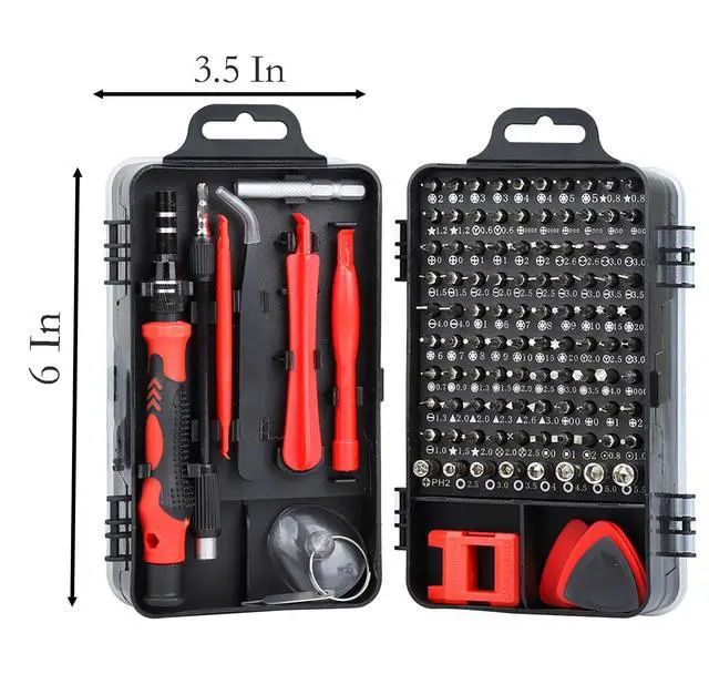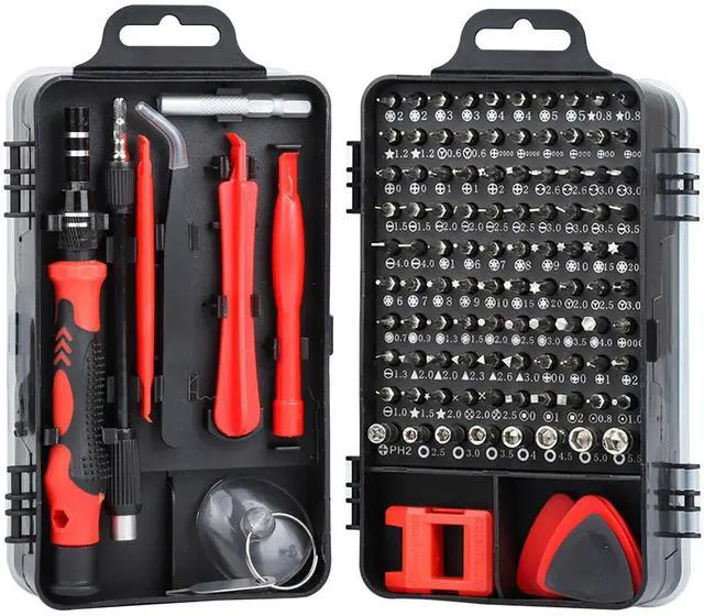 The 115 in 1 Precision Screwdriver Set is a comprehensive tool kit designed to meet the needs of professionals and hobbyists alike. Crafted from high-quality chromium vanadium steel, this set ensures durability and long-lasting performance. The kit includes an extensive selection of bits and accessories, making it suitable for repairing computers, watches, cameras, mobile phones, laptops, eyeglasses, and various electronic devices. Each tool is precisely engineered for accurate and efficient work, while the compact red case provides organized storage and easy portability. Ideal for detailed repair tasks, this set delivers reliability and versatility for a wide range of applications.