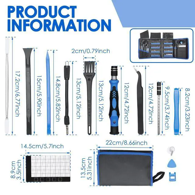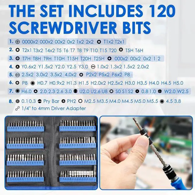 141PCS Precision Screwdriver Set: You will get 120 bits, complete with every driver bit youll need to tackle any repair or DIY project. In addition, the repair kit also includes 21 practical accessories such as magnetizers, magnetic pads, ESD tweezers, suction cups, pry bars, cleaning brushes, etc.