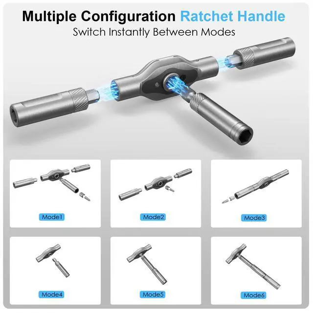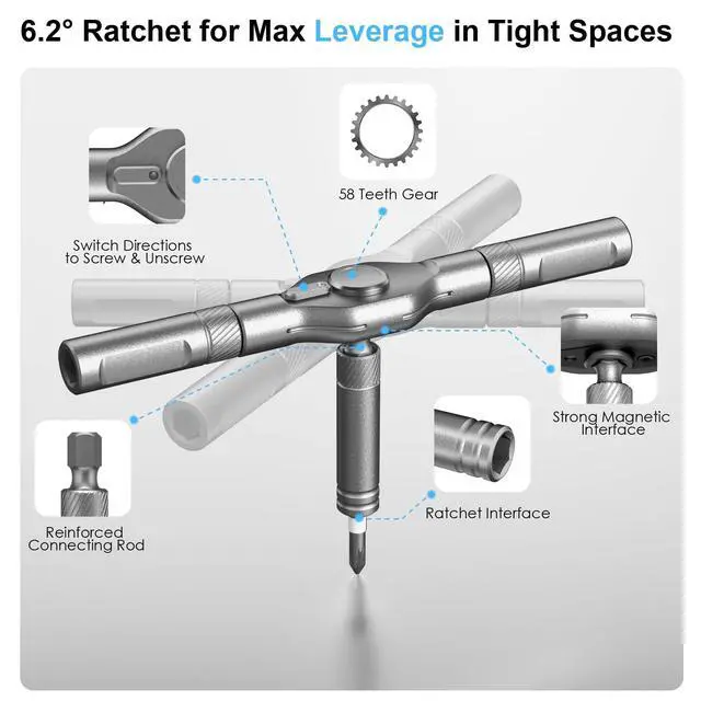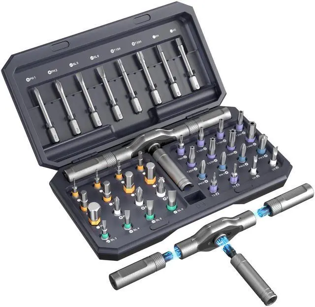 Magnetic Ratchet Screwdriver Functionality: The 42 in 1 magnetic ratchet screwdriver set features a smooth T-handle ratchet mechanism, allowing quick and effortless tightening or loosening of screws saving time and effort during repairs