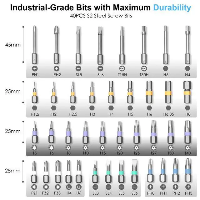 High-Torque Magnetic Screwdriver Bits: Equipped with 40 precision bits (8 long 45mm + 32 short 25mm), including PH, SL, Torx, Hex, PZ, U-type, and wrench tips all magnetic to securely hold screws and prevent slipping