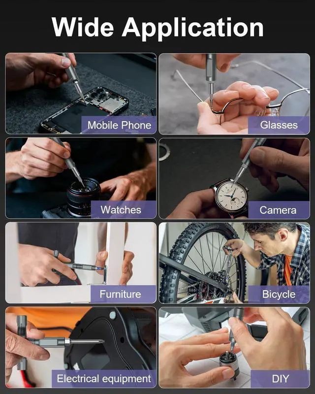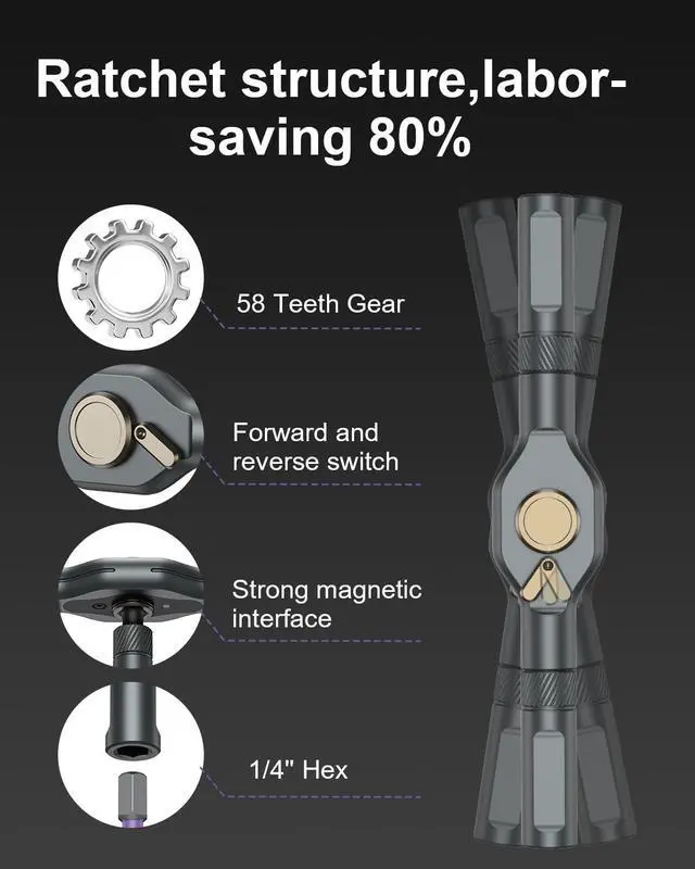 Labor-Saving Ratchet Handle Design: The handle of this ratchet screwdriver is ergonomically designed to reduce wrist pressure and save up to 80% of effort compared to traditional screwdrivers. It uses a precision 58-tooth ratchet mechanism with a swing angle of 6.2° to easily tighten or loosen screws. Such as installing furniture, cabinets, glasses, bicycles and other products that require frequent tightening of screws.