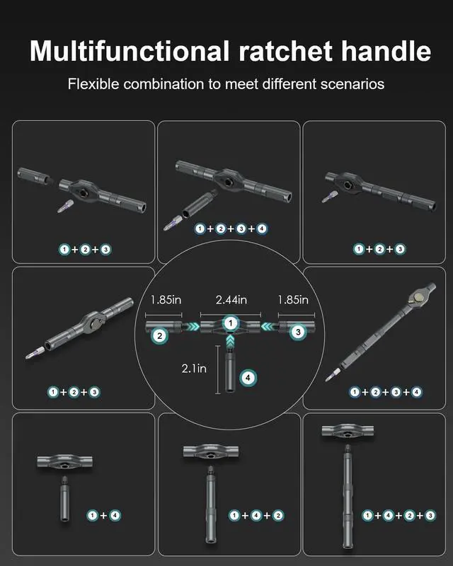 T Handle Ratchet Screwdriver: Equipped with a modular aluminum ratchet handle, which can be freely combined according to different working scene needs and assembled into a T-handle, straight handle or angled handle for working in narrow or awkward spaces. Ideal for mechanics, technicians and DIY enthusiasts who require precision and comfort.
