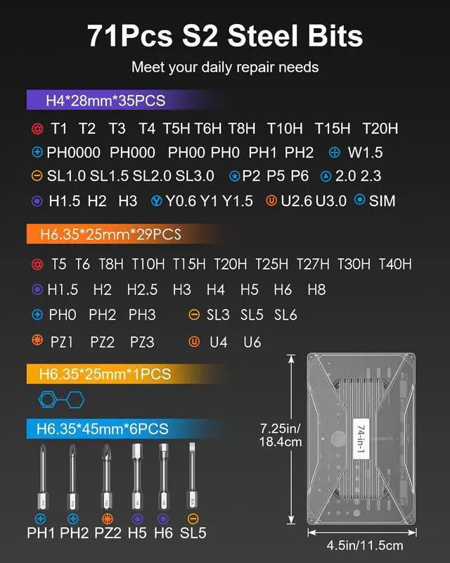 74-in-1 Magnetic Screwdriver Set: All-in-one multifunctional magnetic ratcheting screwdriver set, including 6 expansion bits (H6.35×45 mm), 29 standard bits (H6.35×25 mm) and 35 precision bits (H4×28 mm) and 1 precision bit adapter (6.35-4.0), including PH, SL, Torx, Hex, PZ and U-type types. The precision bits among them are very suitable for home repair of watches, computers, doorbells and other electronic products.