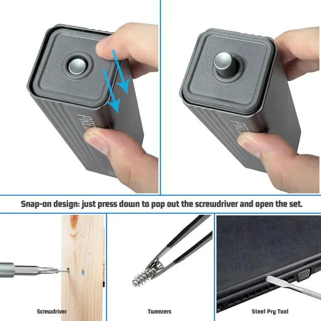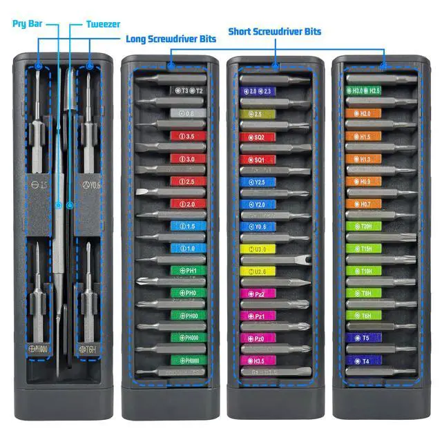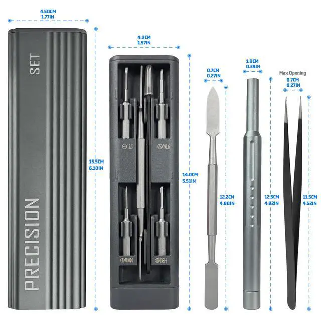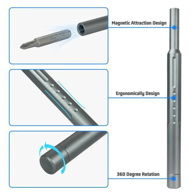 High-Quality, Durable MaterialThese bits are made of high-quality S2 steel with a hardness of HRC62+, and have undergone heat treatment and CNC-machining to ensure excellent durability and precision. Magnetic tips provide secure handling of small screws, while spare bits for common types like Phillips, Slot, and Tri-point are included to keep your repairs convenient.