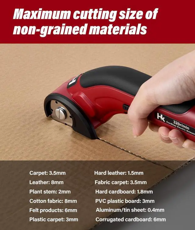 HK cardboard cutter offer extraordinary versatility, easily cutting through materials like cardboard, leather, paper, plastic packaging, canvas, carpet, wallpaper, wire mesh, and more. It handles materials up to 1/4 thick with ease.