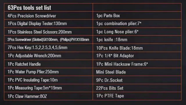 Edward Tools Harden 63 Piece Tool Set with Tool Box is the perfect handyman small tool set for college, home, or contractor use. This essential tools set includes the following tools: 4Pcs Precision Screwdriver * 1Pcs Digital Display Tester:130mm * 1Pcs Stainless Steel Scissors:200mm * 2Pcs Screwdriver:(Slotted)5X100mm, (Phillips)PH1X100mm * 7Pcs Hex Key:1.5,2,2.5,3,4,5,6mm * 1Pc Adjustable Wrench:200mm * 1Pc Ratchet Handle * 1Pc Water Pump Plier:250mm * 1Pc PVC Insulating Tape:10m * 1Pc Measuring Tape:5m*19mm * 1Pc Claw Hammer:8OZ * 1pc Parts Box * 1pc combination plier:7" * 1pc Long Nose plier:6" * 1pc knife :18mm * 10Pcs Knife Blade:18mm * 1Pc 1/4" Bit Adaptor * 1Pc Mini Hacksaw Frame:6" * Mini Steel Blade * 9Pc Dr.Socket * 22Pcs Bits Set * 1Pc PTFE Tape All tools are made of heavy duty hardened steel. The heavy plastic tool box keeps your tools protected and organized. Edward Tools Harden 63 Piece Tool Set comes with a lifetime warranty for the box and all included tools.