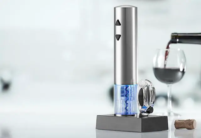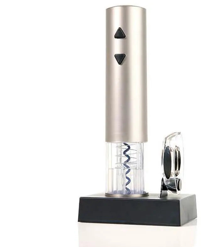 Uncorking bottles is easy and fun with the Rechargeable Wine Opener with Foil Cutter. This handy device recharges on its base, so youre always ready to open a bottle of your favorite wine. It works with all standard and oversized wine bottles, and can uncork 30-40 bottles on a full charge.