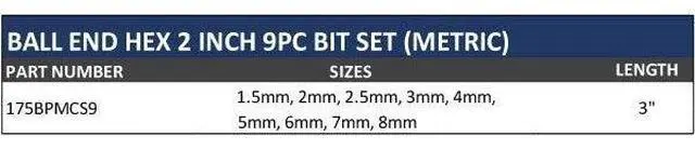 VEGA 175BPMCS9 Ball-End Hex Hex x 3 in 9 pieces Set
