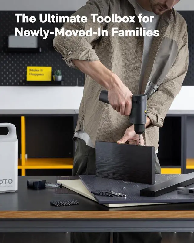Ultra-Light & Ultra-Cool: his electric drill is all about easy elegance. It weighs in at just 0.55 pounds, the double-layered soft grip is crafted from tough plastic and TPE rubber for ultimate comfort. The frosted aluminum alloy storage box holds all 12 bits, giving you a ton of DIY possibilities. And that soft rubber handle on top. Makes the whole box super portable. So get ready to look and feel like a DIY superstar