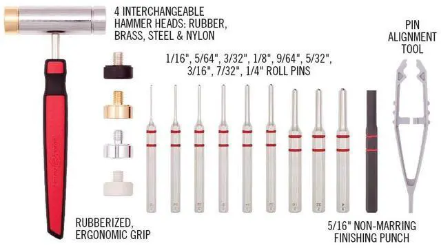 | Included Components | 4 Interchangeable Hammer Heads: Rubber, Brass, Steel & Nylon, 5/16" Non-Marring Finishing Punch, Accu-Punch Hammer & Punches set, Ergonomic Hammer, Pin Alignment Tool, Roll Pin Punches: 1/16", 5/64", 3/32", 1/8", 9/64", 5/32", 3/16", 7/32", 1/4", Smart Bench Block, Stand-Up Tool Case |