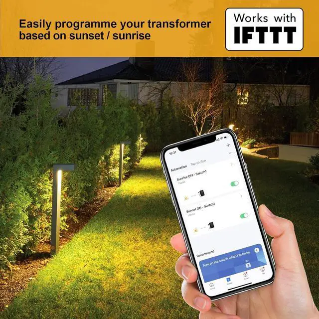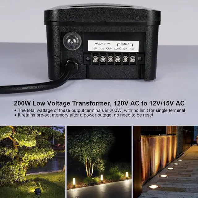 [Memory Function & Smart Plug Compatibility] The 200 watt low voltage transformer retains preset modes after power outages; compatible with smart plugs and timers for enhanced control of landscape lighting transformer systems, including deck and driveway lights