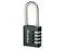 40mm aluminium with black finish padlock - 51mm chrome plated steel long shackle, 6mm diameter - 4-digit resettable combination (10,000 possible combinations)