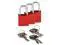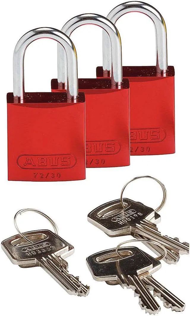 Lockout Padlock, Key Type Alike, Body Material Aluminum, Shackle Dia. 1/4 in, Shackle Height 1 in, Shackle Material Steel, Shackle Width 3/4 in, Body Width 1 1/4 in, Body Thickness 5/8 in, Includes (3) Padlocks, Standards OSHA 1910.147, Body Height 1 7/16 in, Body Color Red, Shackle Type Open, Number of Bumpers 0, Control Key Registration Required No, Package Quantity 3. This item has been restricted from sale in the following state (s): []